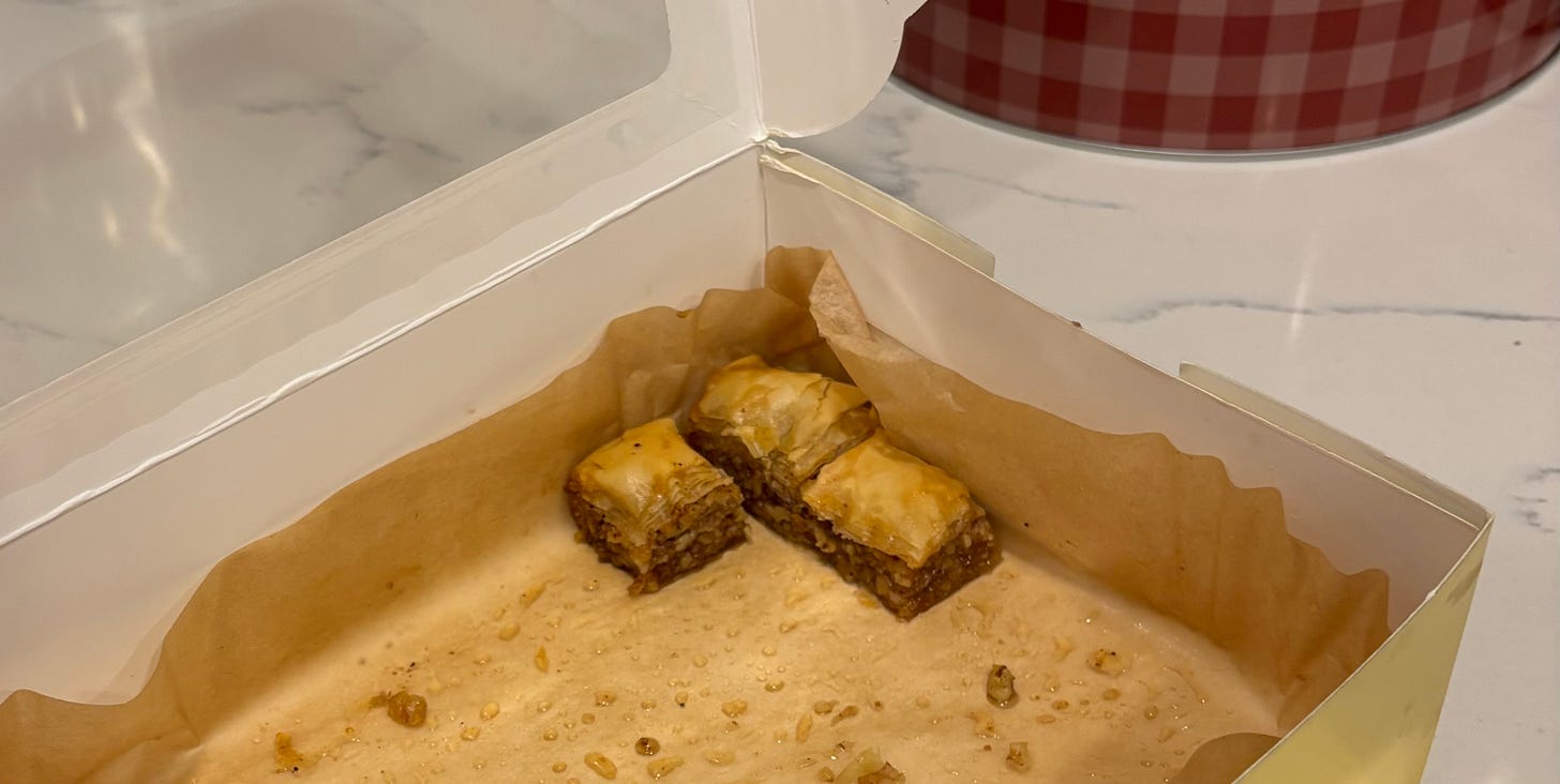 I eat one slowly, then another, let the sweetness and crunch dawdle together. My daughter and I have been declaring “Baklava for breakfast!” regularly this winter break. I’ll leave her the last piece.