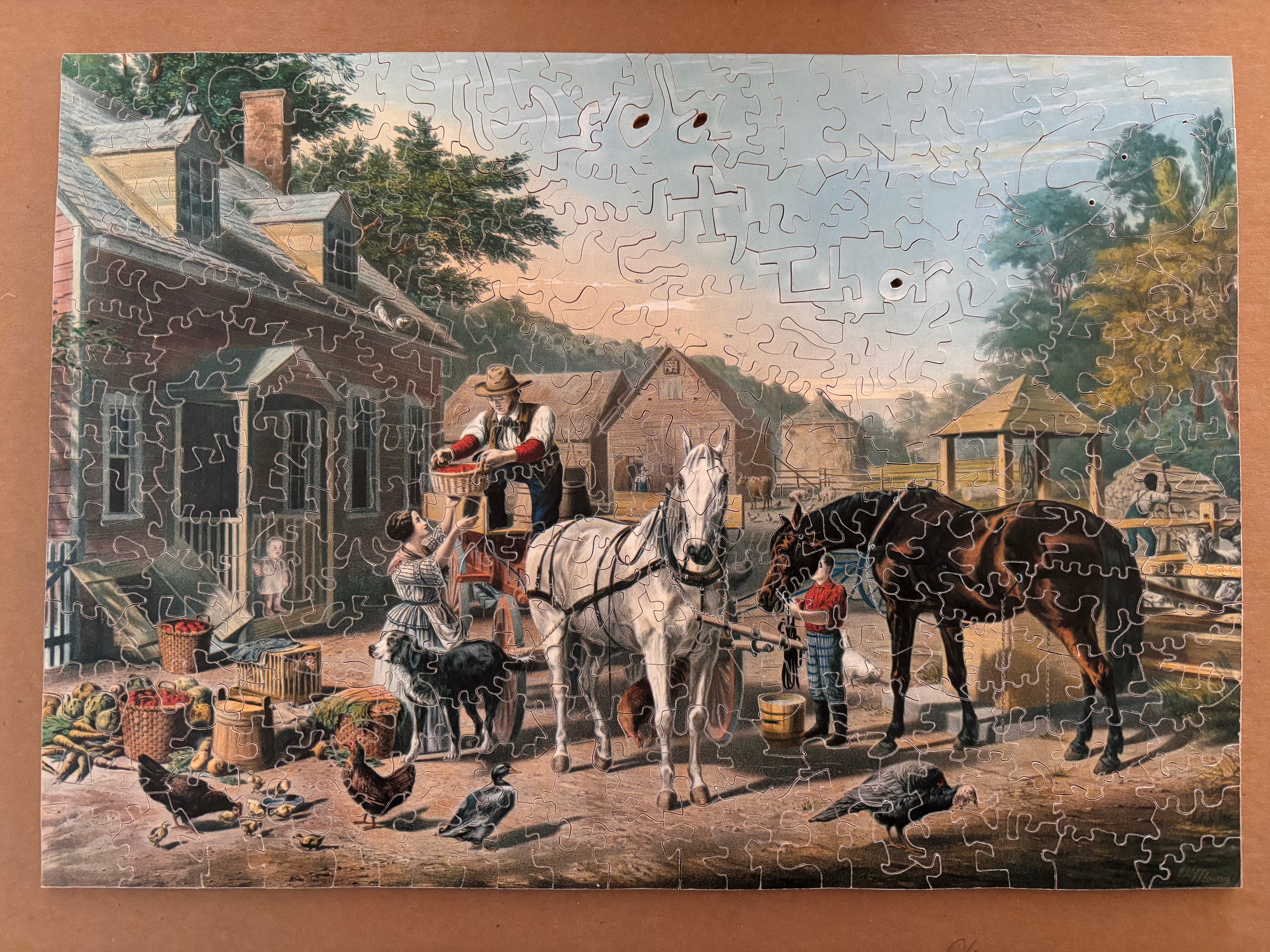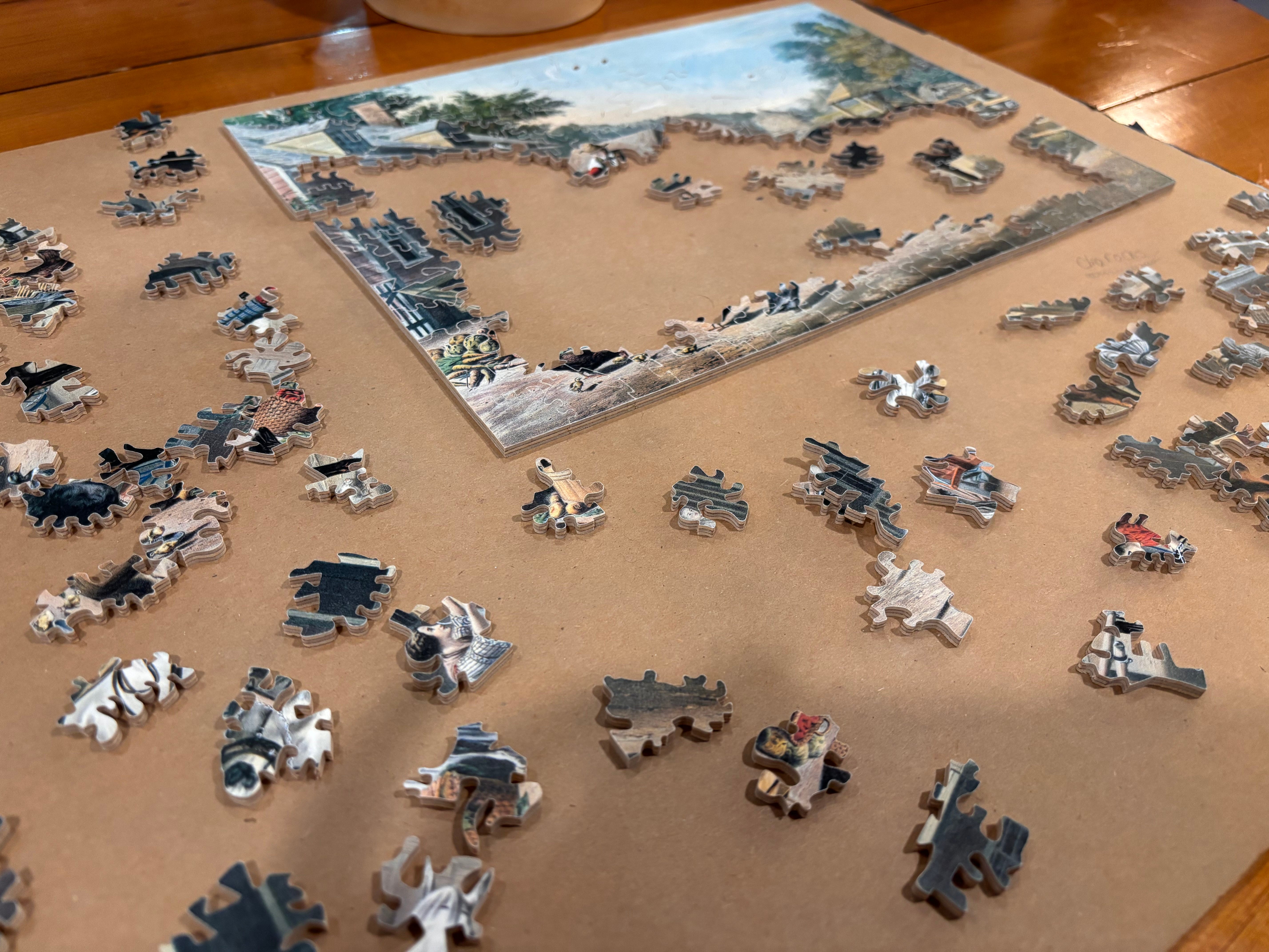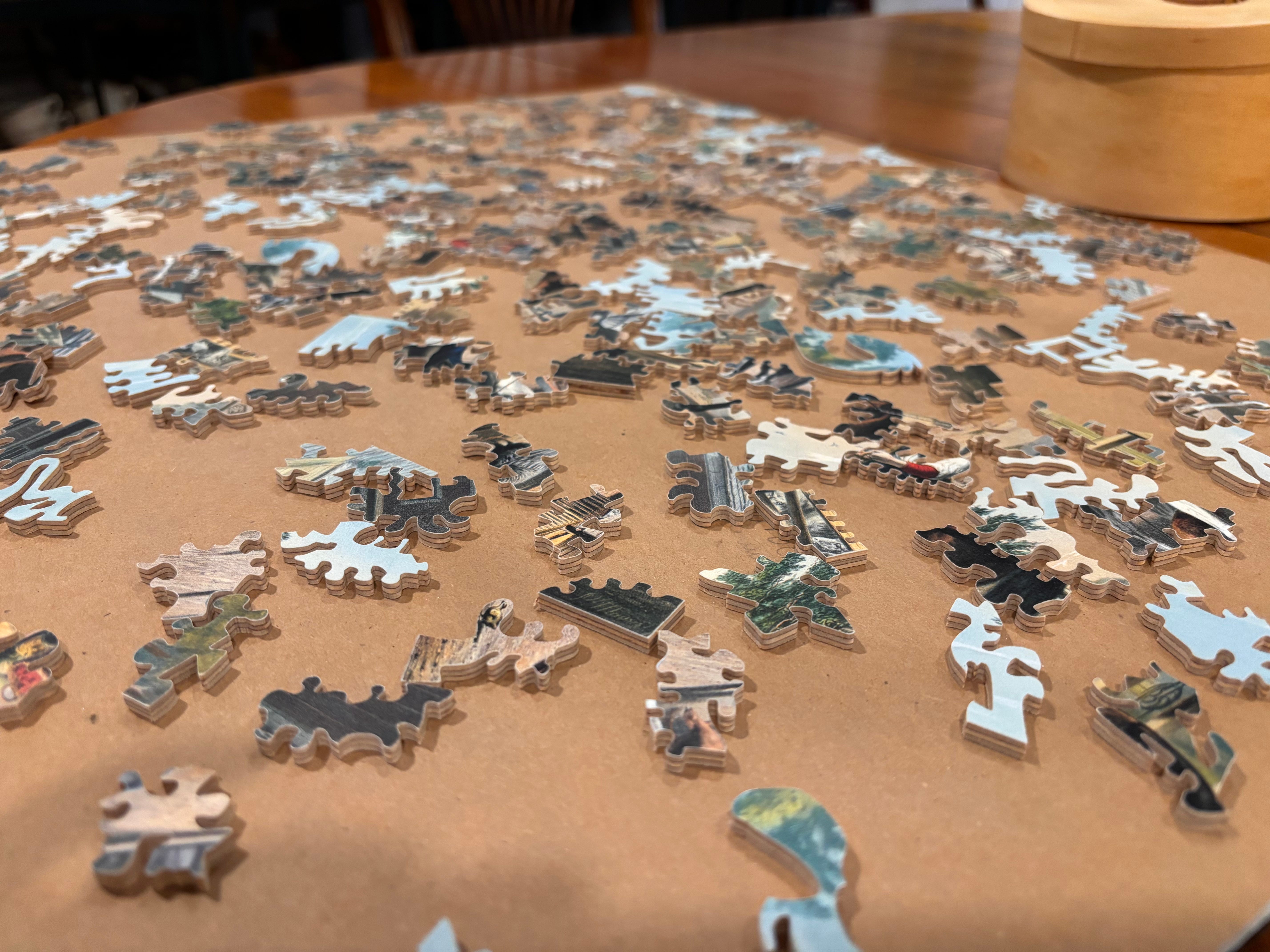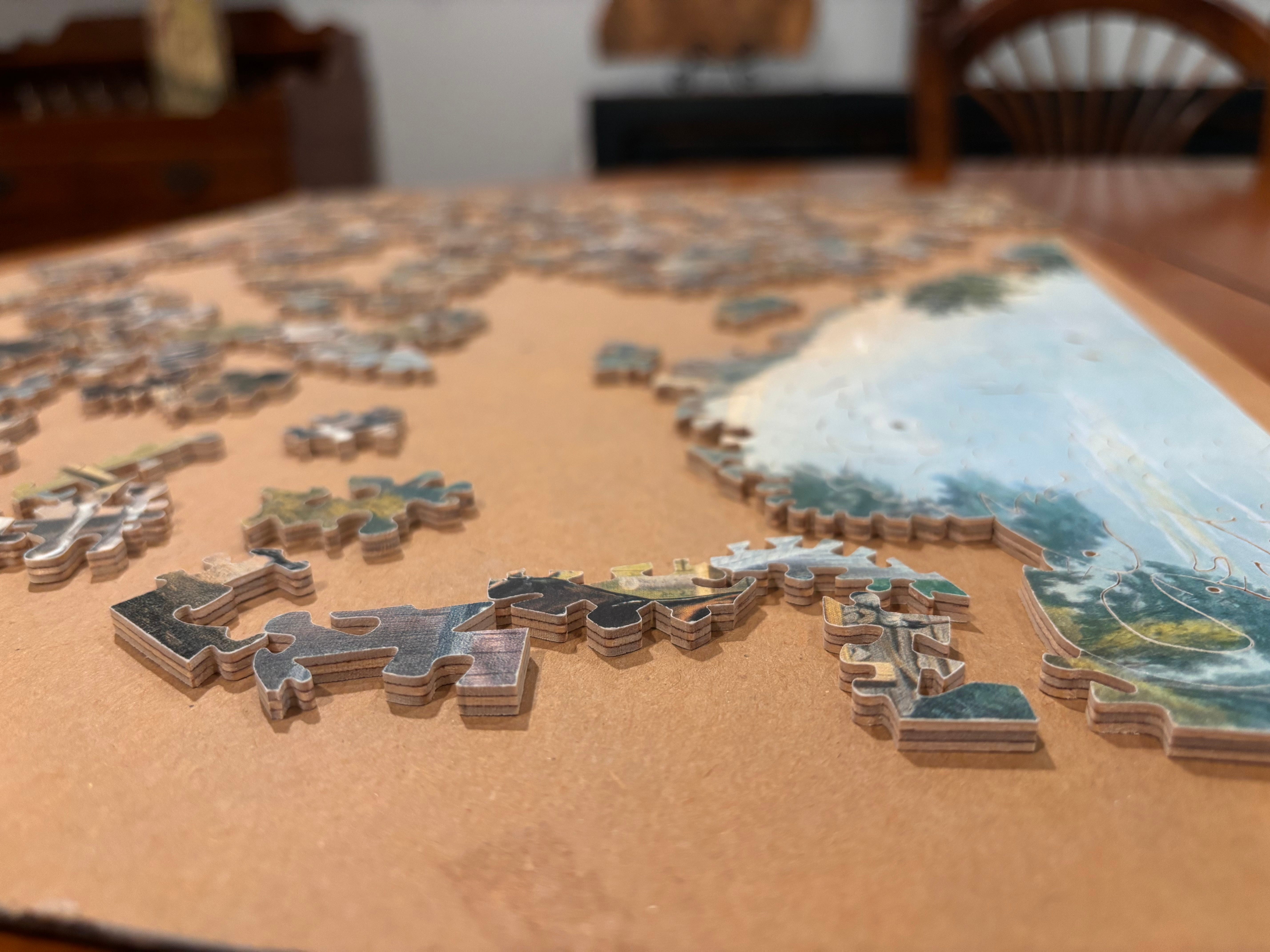 My dad made this one, a skill he picked up from his uncle. It’s wood, smells of cedar and nostalgia. I turned all 232 pieces right side up, their delicate loops and bumps as familiar as the hands that made them. There is no photo on the box of what I’m working towards. That’s how it was with puzzles in our family: picturing a complete scene would have taken the fun out of watching it take shape in front of us (or so my sister and I were told.)